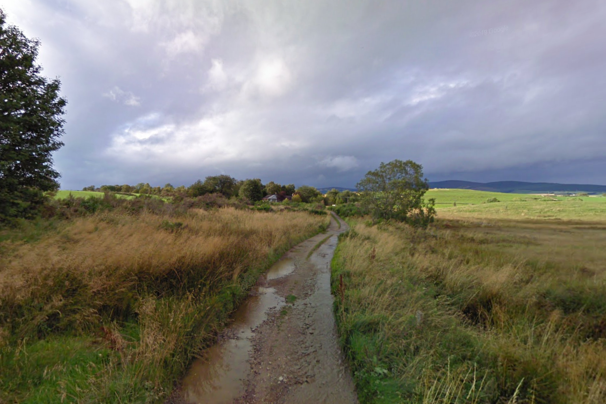 Right | The A980 from Lumphanan toward Torphins, built on the path of the old turnpike road, which in turn was probably built on a path much like the one at left. | Screen-capture, Google Map Street View