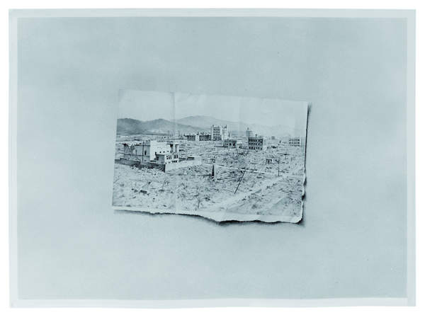In Vija Celmin’s drawing Hiroshima, we are made conscious of the photographic origin of that city’s post-apocalyptic reality: an exaggerated, uneven border between the drawn image and the edge of the drawing, combined with the distressed “paper” of the photo suggests a clipping from a newspaper folded into a scrapbook, a memory of reality. Even the medium—graphite—becomes ambiguous, since the subject is a black-and-white photograph.
