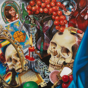 Less self-conscious of origin, but no less referencing photographic reality, Audrey Flack goes wild with texture, color, and disorienting reflections. In this manner, Wheel of Fortune (Vanitas) recalls the meticulous works of 17th Century Dutch still-life artists. The self-referential memento-like accumulation of objects, including photographs and other graphic material, creates a different, more personal memory of reality.
