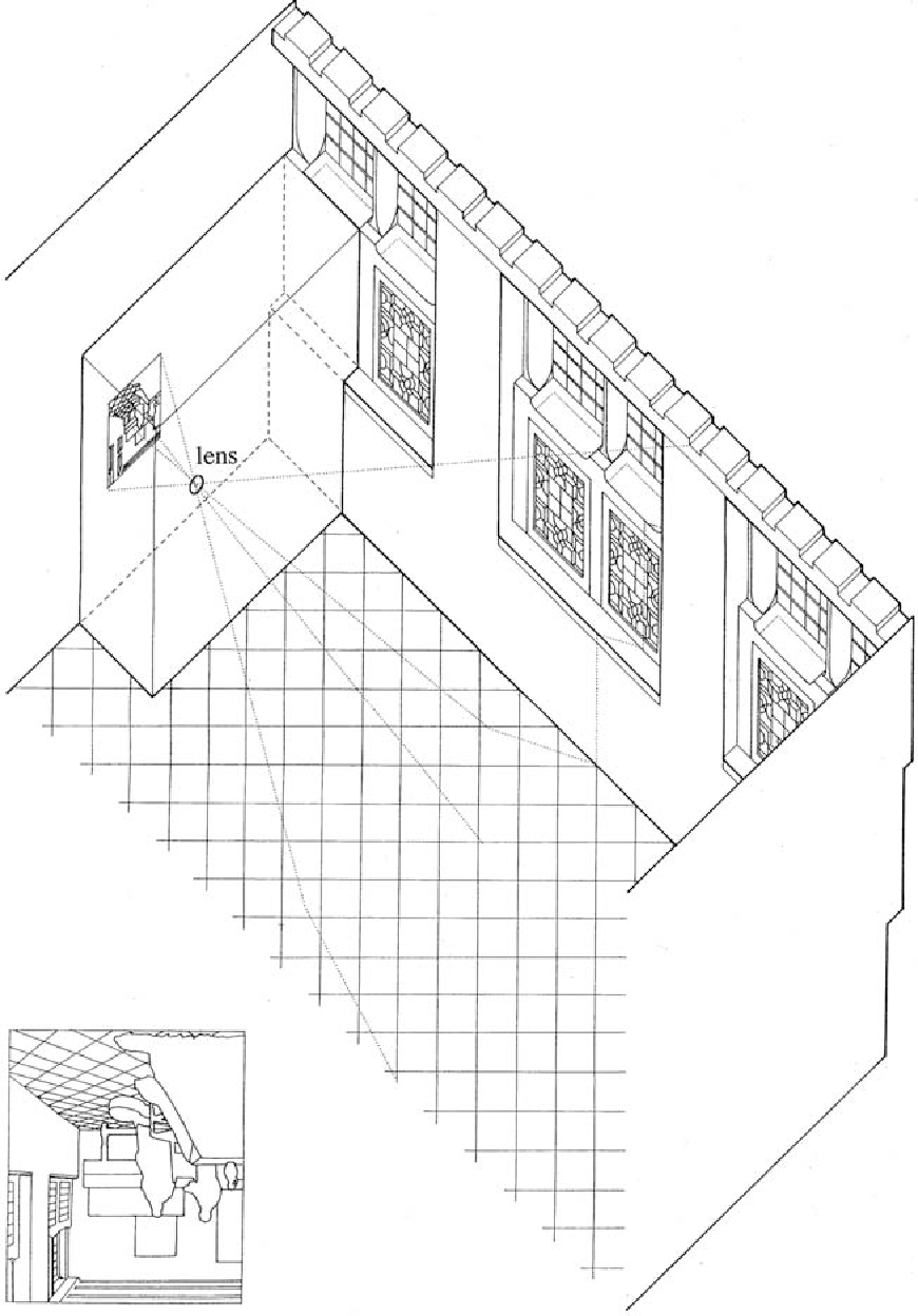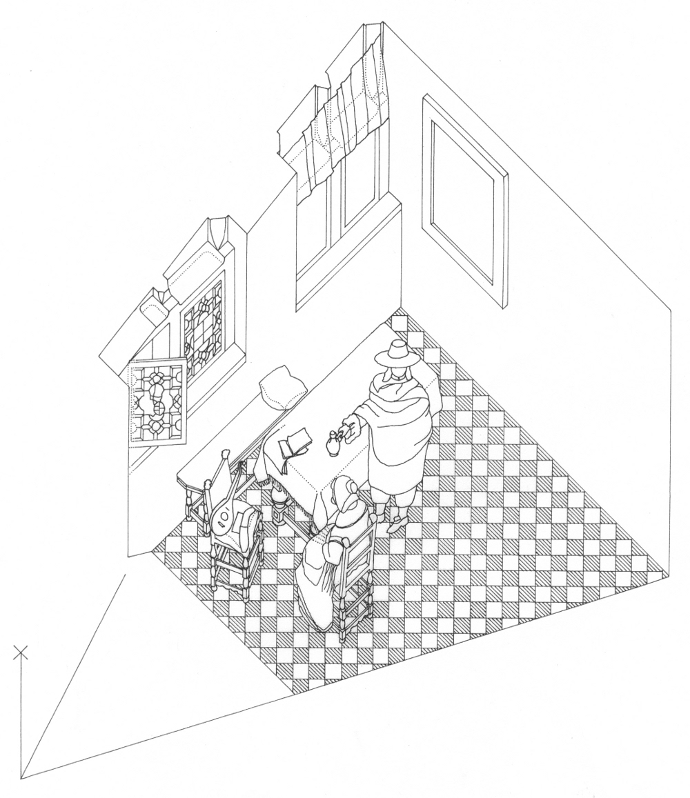 Philip Steadman, Bird’s eye view of Vermeer’s studio set for painting The Glass of Wine, 2001