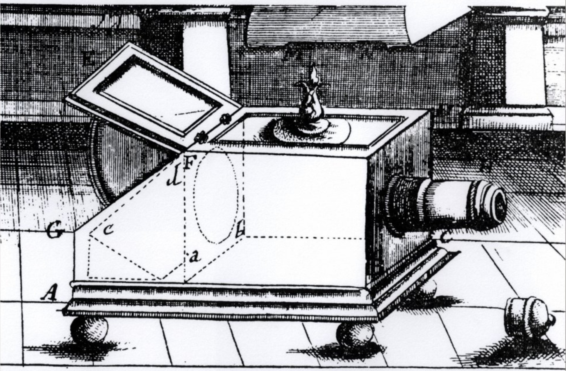 The camera obscura (a Latin phrase meaning “room of darkness” or “dark room”) was a box with a pinhole, refined with the addition of lenses and screens in the mid-1600s to the degree that it became small enough to be portable. According to artist David Hockney, physicist Charles Falco, and historian Philip Steadman, artists like Jan Vermeer began using tools like the camera obscura to refine their depiction of realistic scenes.