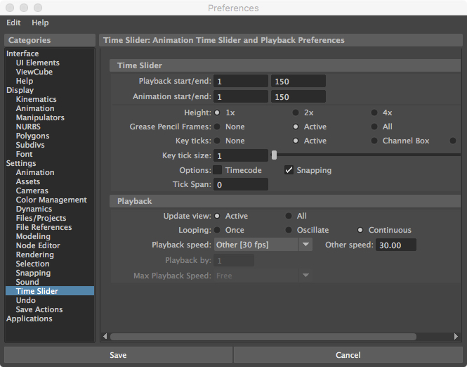 • In the new scene, open Time Slider Preferences (the gear with running figure icon at lower right of interface). Set Playback and Animation start/end for 5 or 6 seconds. In the sample, to get 5 seconds at 30 frames per second, we set them at 150. Set the playback speed to 30fps by choosing Other from the dropout and entering 30.00 in the field that activates.