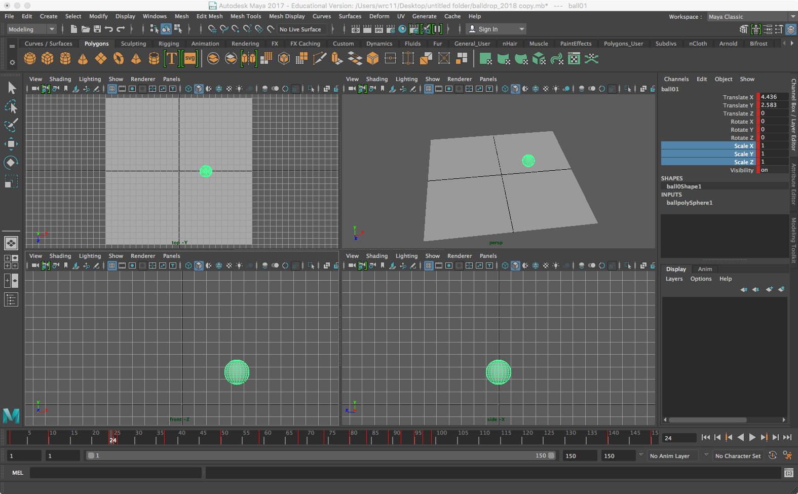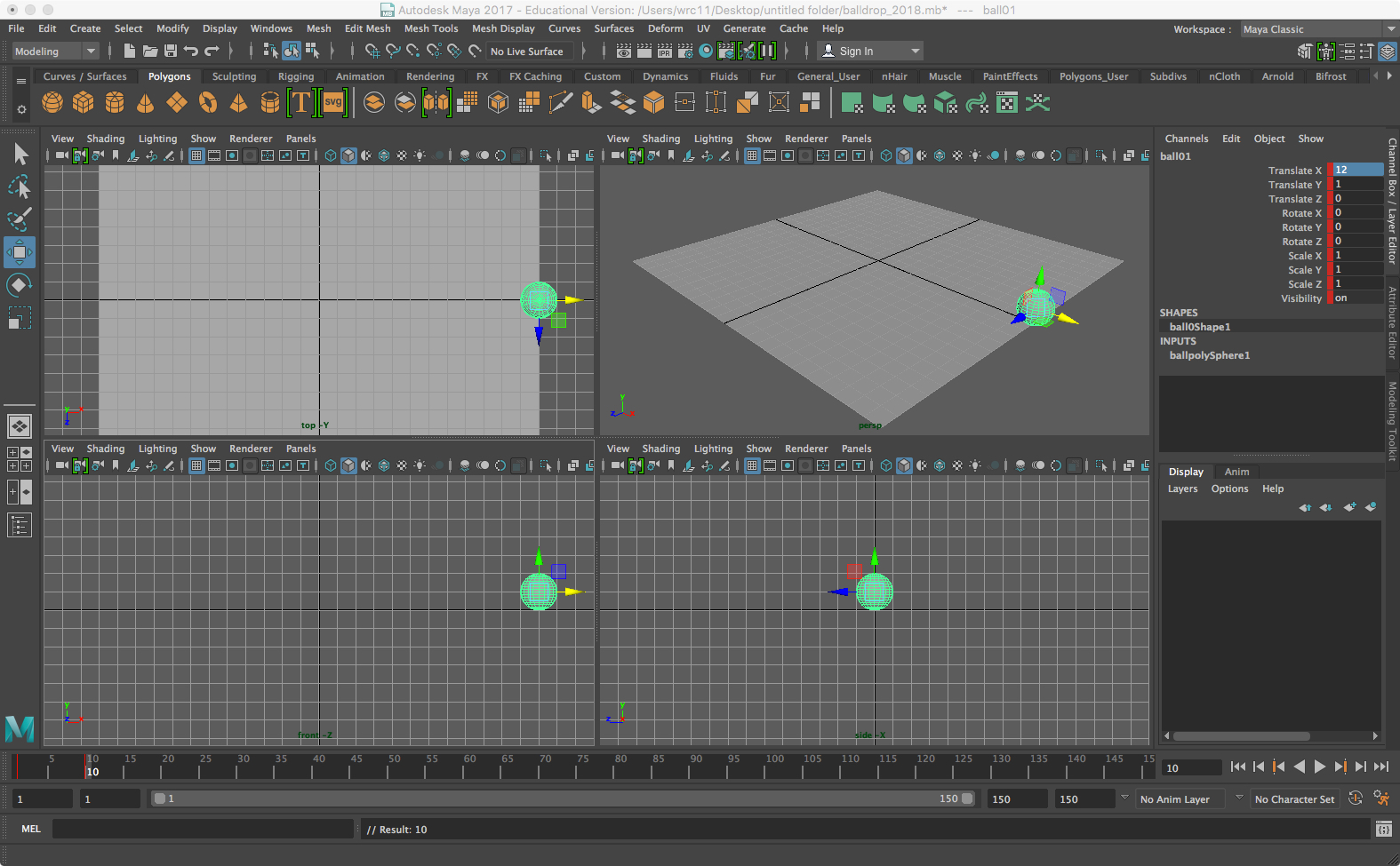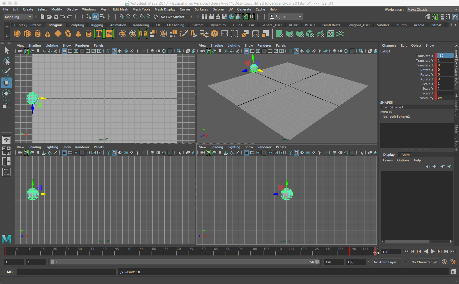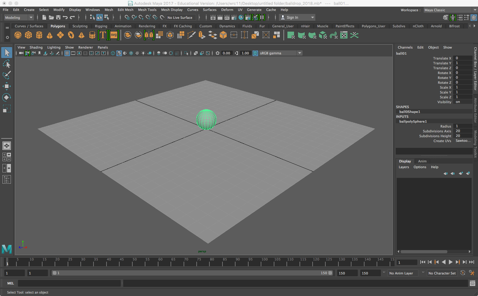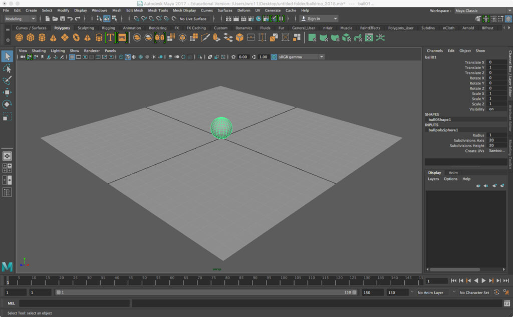 • Create a ball by making a polygon sphere with a small, whole number radius, and move it vertically equal to that radius. In the sample we created a sphere of radius = 1 (the default), and translated with Move Tool so that Translate Y = 1 in the Channel Box (you can also just enter the data there). Name it ball01.