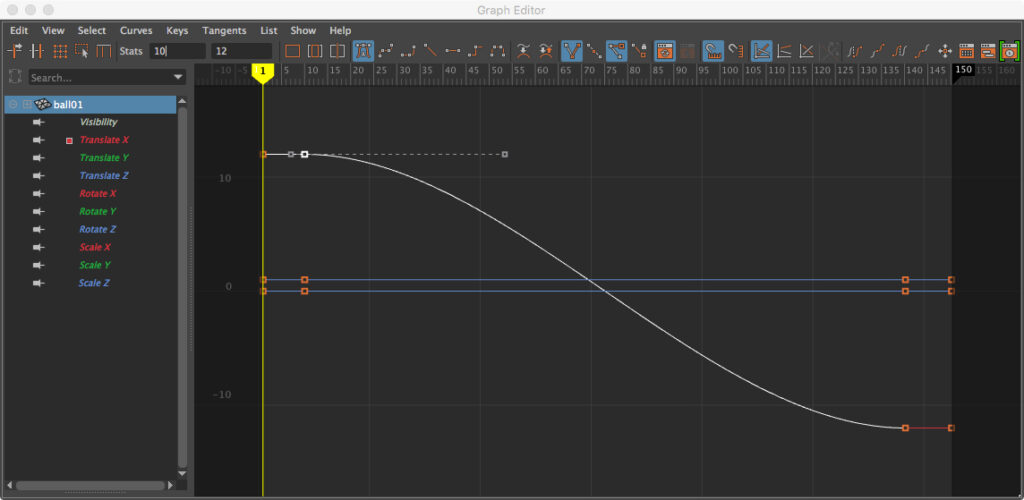 • At Frame 1, move ball01 to a whole number position on the X axis, and hit S on the keyboard to set a key. Note the red line indicating a key has been set. In the sample, we set Translate X = 12 in the Channel Box.