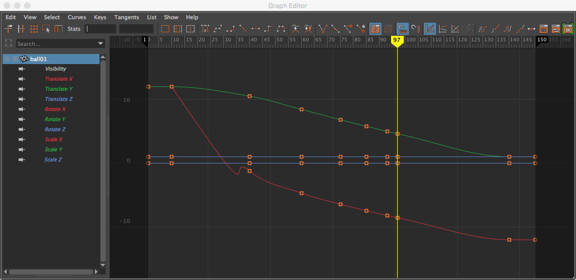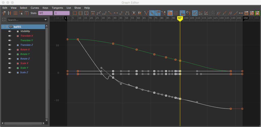 The vertical trajectory is more complex, and we apply it to the simpler horizontal movement. While the horizontal velocity is a constant but gradual deceleration as it loses energy to the bouncing, the vertical is a pattern of acceleration (at the base of the bounce) and deceleration (at the apex), slowly decaying until the pattern stops after a few bounces. The Graph Editor makes easy, if a bit tedious, work of this interplay.