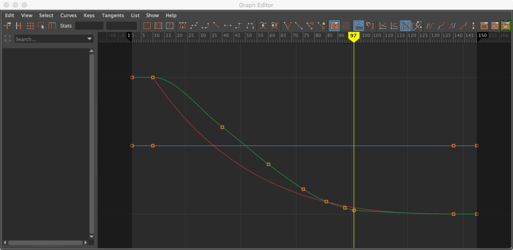 • At the upper left of the interface, select the Animation menu set, then select Windows>Animation Editors>Graph Editor. The Graph Editor is much improved in recent versions of Maya, and it is the best place to manage refinements to established set keys.