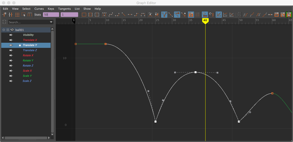 Run the timeline. The ball smacks the ground now but these aren’t crisp, parabolic curves yet.