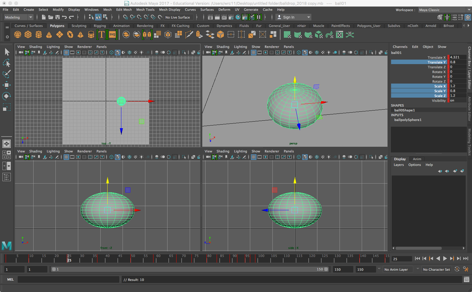 • At the first base key, select ball01 and use the Channel Box to enter new Scale X, Y, and Z values. These seem small but they are actually exaggerations of how most balls deform when bouncing. In the sample these values are: