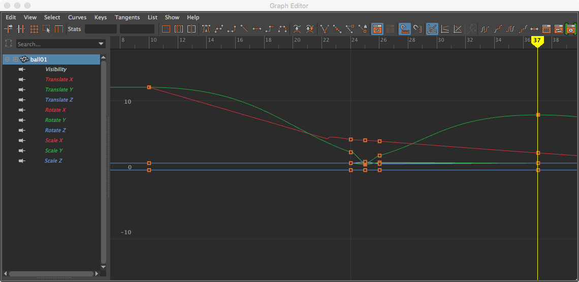 • In the Graph Editor, notice the spacing of apex keys needs some tweaking. Even though we set midpoints before, the tangent adjustments reveal the apices are off by a frame or two.