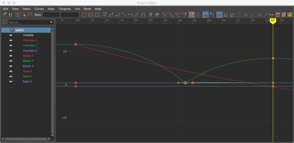 In other words, through clever use of the timeline, set keys, and Graph Editor, it’s possible to solve the horizontal vector first, apply the vertical vector next, and refine by applying squash and stretch principles to illustrate the internal reactions of the ball when striking the ground last.