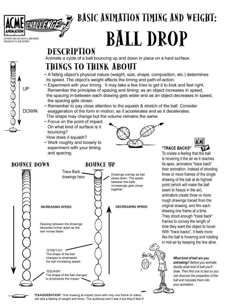 All ball bounces are not created equal. The Acme guide suggests you figure out what kind of ball to animate before you begin. Once you decide, you can find a video reference for timing and observation. Many exist and can be found by keywording ball drop in a search engine, but Michele Schottenbauer’s compilation seen here is excellent. The football, rugby ball, and hackeysack are funny, but probably outside of our scope of choice.
