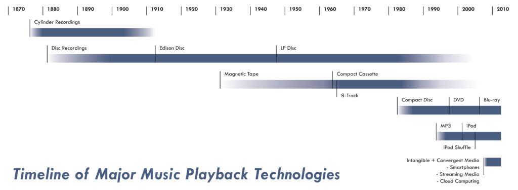 That’s as far as I’ll take a stab at being a futurist. With the pace of change being what it is (and still accelerating), I imagine this title will be edited more often than any other. The future isn’t what it used to be because it used to be the future. Rates of technological obsolescence make for an ever-diminishing half-life for the futurists’ game. Here’s an example: a timeline representing the rates of change for major market musical recording technology since Edison’s experiments with cylinder recording: