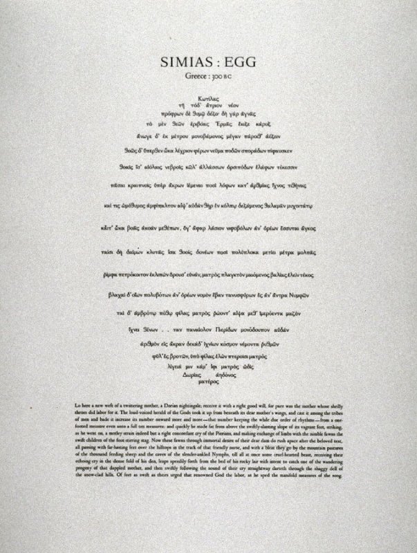But no matter how enthusiastic the poet may allow himself to become about the potential … of the new visual poem, when he gets down to practicalities, he is confronted with certain problems inherent in his materials. If he is going to find poetry in the visual dimensions of words, he must learn to handle them typographically. In the world of advertising where visual communication with words is a cut-throat business, it is the designer’s job to decide which type face or type faces will best persuade the viewer… . The poet’s typographical concerns are far more subtle and significant, and he should exercise even more care, perhaps, in making typographical decisions; for the form, weight and scale of letters and words can be used to heighten, can at best become physically part of what he has to say; they can unobtrusively have little effect upon what he has to say; or they can intrude a discordant note into what he has to say.