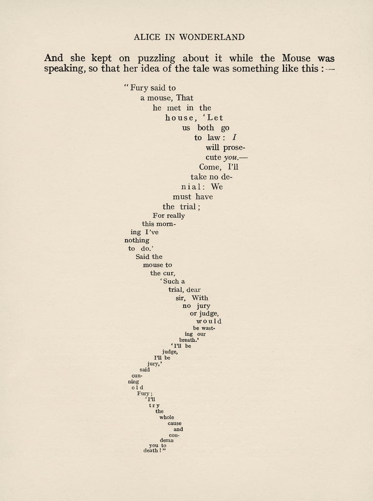 The most salient feature of concrete poetry is how word becomes image, clearly expressed in the examples below. The earliest of these, Lewis Carroll’s The Mouse’s Tale, is a typically Carrollian quadruple pun: part of a tale about a tail, the poem is typeset in the shape of a tail, with the rhyme occurring at the end of each line (known as a tail rhyme). It is structured with an AABCCB rhyme scheme which is easier to see unformatted (akin to HTML content without CSS applied):
