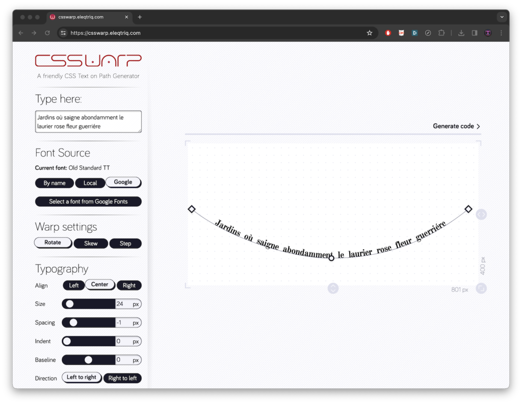 Screen capture showing the use of CSSWarp