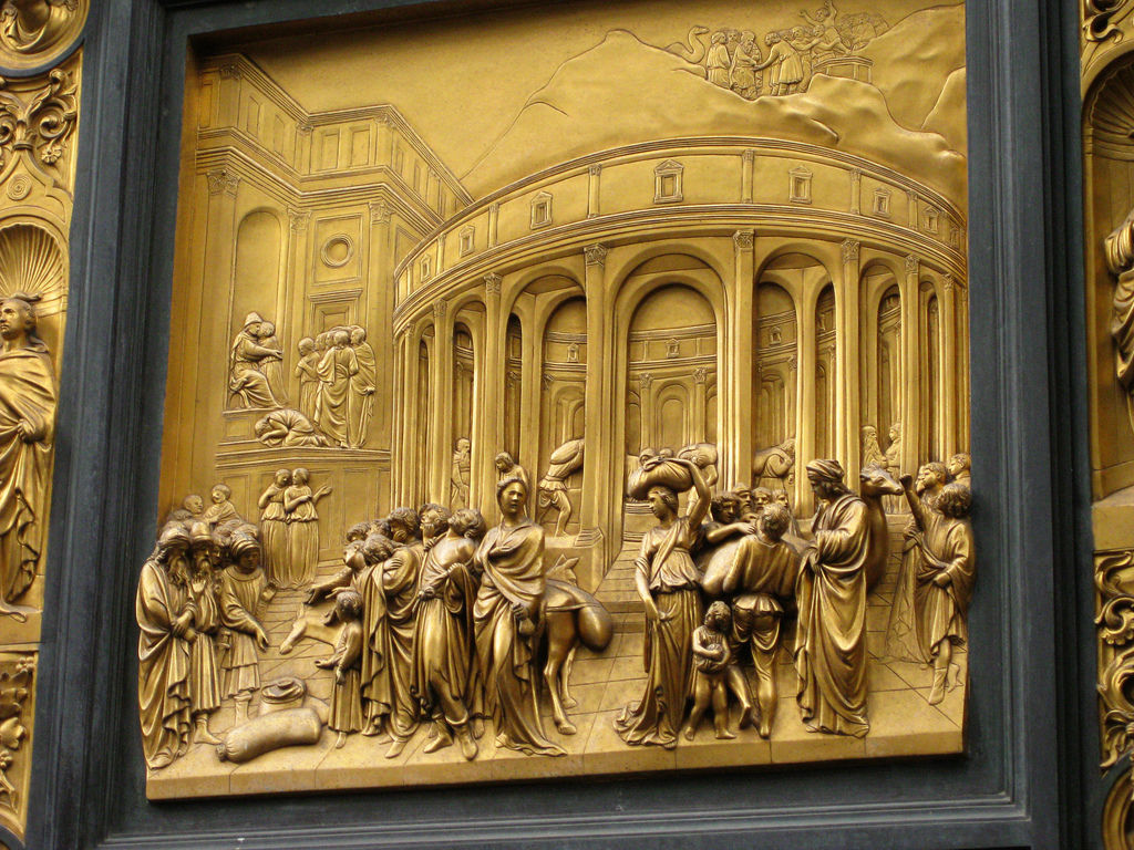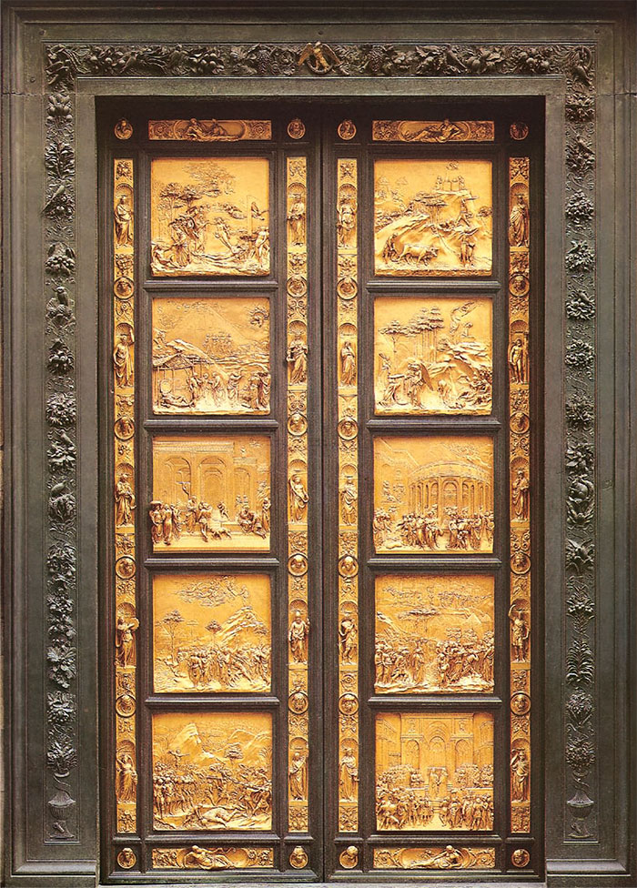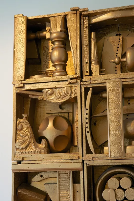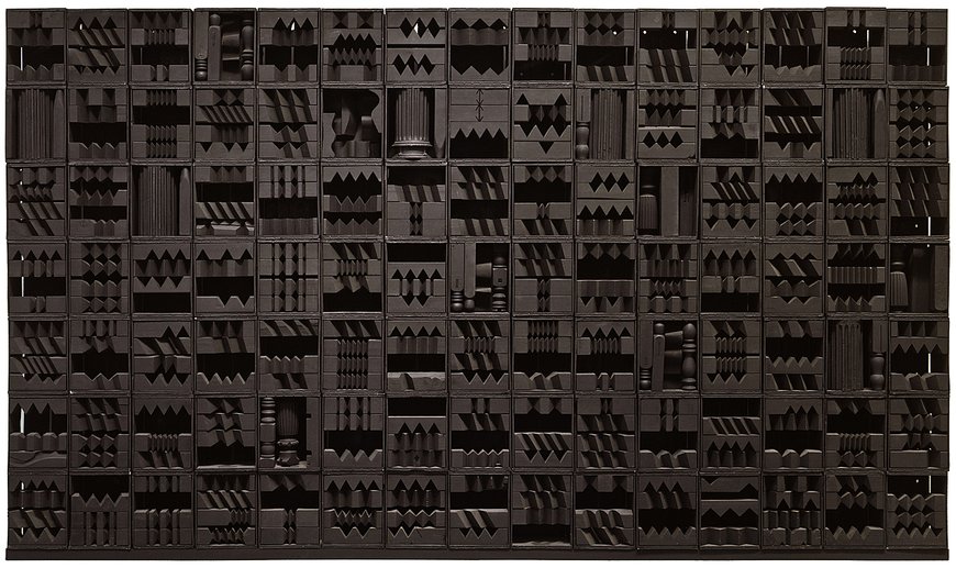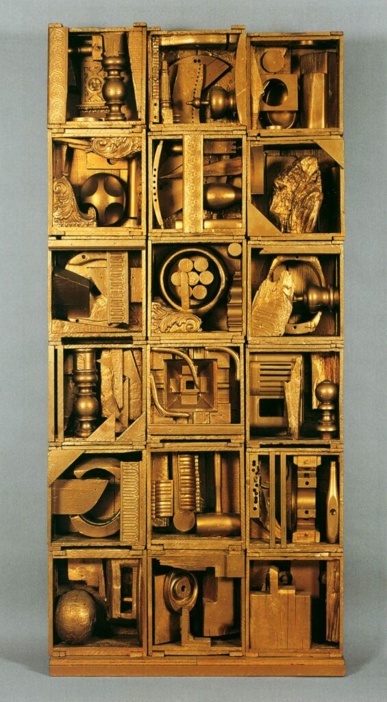 Nevelson was a pack rat. She collected old wood and architectural elements from demolished buildings, recycling them by collaging finials, medallions, scraps, and fragments of carvings into boxes. She would then unify them by abstracting them into a uniform color and finishing through paint. This was usually black as we see in Luminous Zag. But sometimes she’d break out the white — or even gold, as seen in Royal Tide. She’s possibly evoking the spiritual majesty of a particular historical relief work: Ghiberti’s Gates of Paradise on the Baptistery in Florence, Italy.