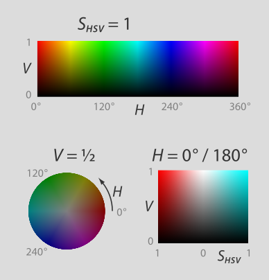 The HSV color space reorients the geometry of the RGB space to solve these perceptual deficiencies. How? It creates a radial coordinate space that maps well with the flat color wheel.