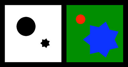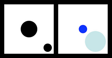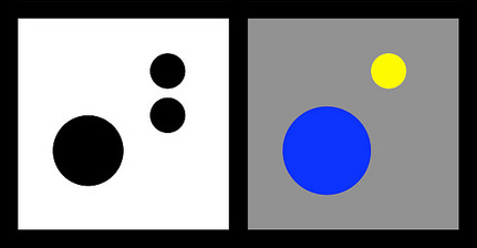 But at left, this reverses when a highly saturated color is applied to a smaller central object, now balanced by a larger, lighter object at the edge