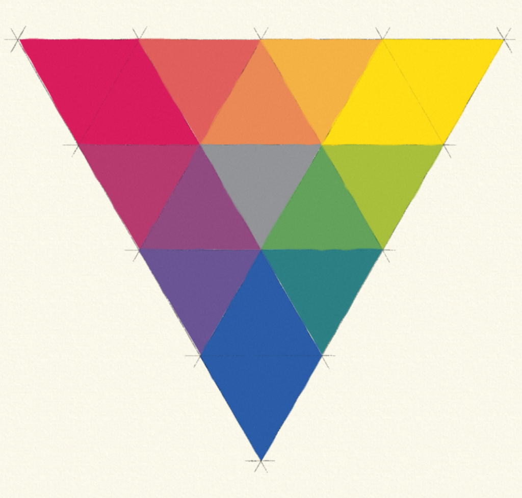 Here we see a color triangle, similar to a color wheel, has been made from three of these primaries: red, yellow, and blue. This is known as the RYB color model, familiar to most people from kindergarten. Note the presence of a middle value gray in the center triangle, important for understanding saturation.