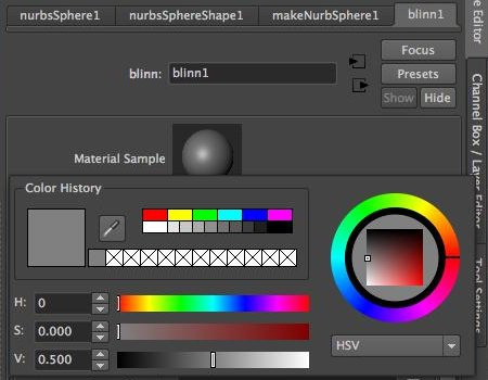 Maya color picker: note the HSV values describe a middle value gray
