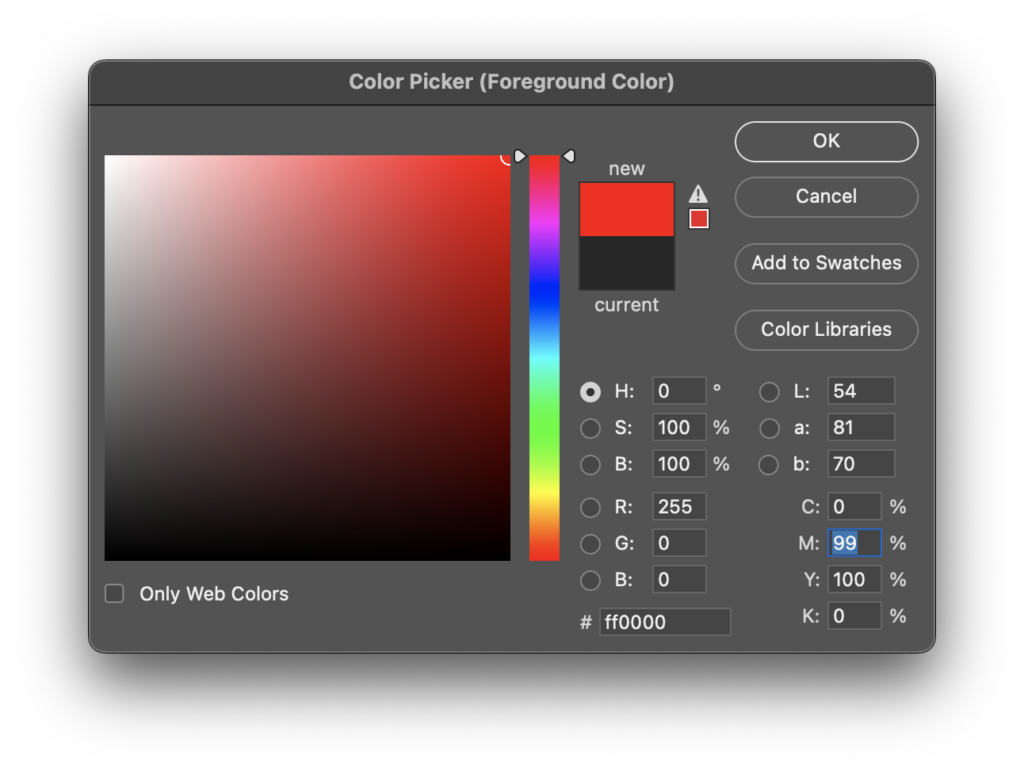 Photoshop color picker: note the HSB values describe a pure red