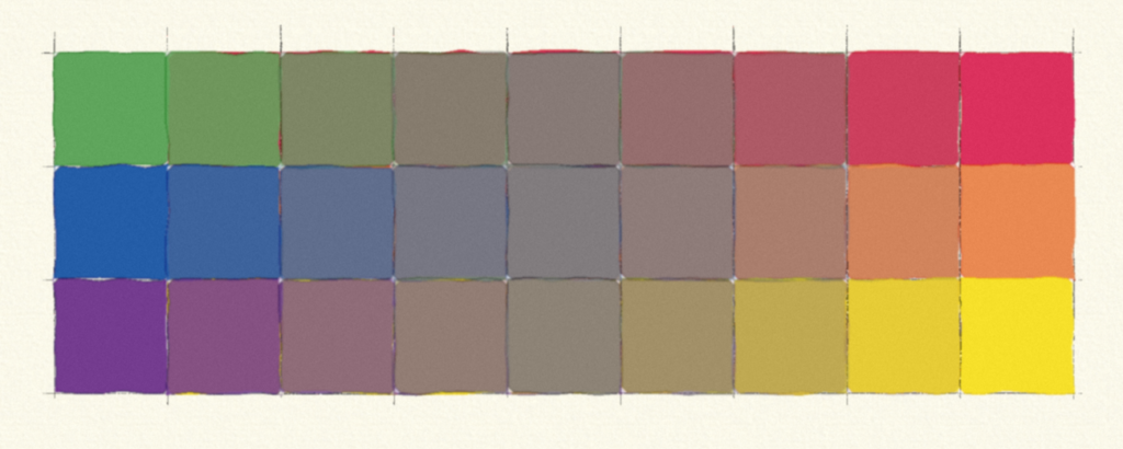 The integrated wheel gives us a standard set of hues that work in tactile color mixing as well as across computer applications. This wheel acts like the traditional wheel, but we need to reassess some traditional relationships. Complementary colors, for example, are shifted (the complement for blue is yellow, not orange, for example).
