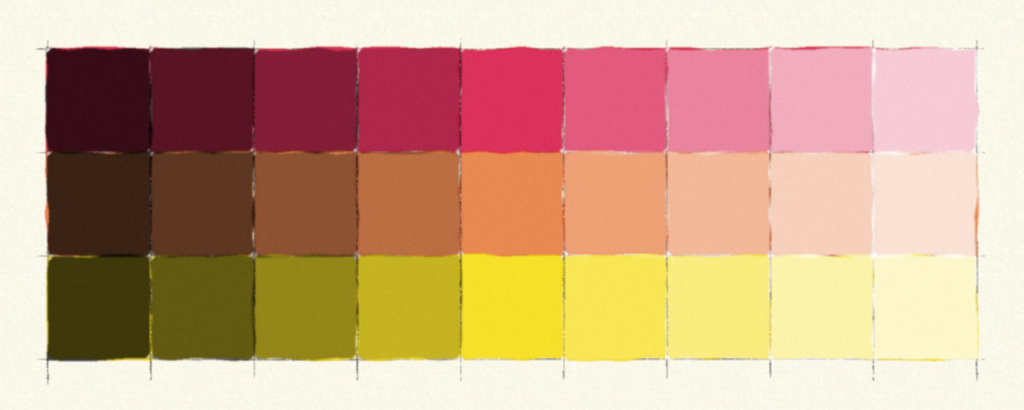In the painter’s study at left, the pure hue is found in the center column. Black is increasingly added toward the left to create shade. A maroon color is a shade of red. White is increasingly added to create tint. Pink is a tint of red.