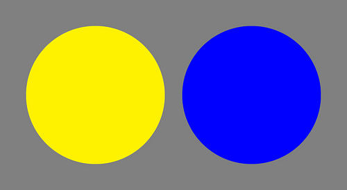 In the graphic at right, yellow (HSV values 60-1-1) and blue (240-1-1) represent warm colors (those that visually advance) and cool colors (those that visually recede) at their most extreme, seen here on a neutral, middle-value gray (HSV = 0-0-0.5) field. Can you perceive the push and pull?