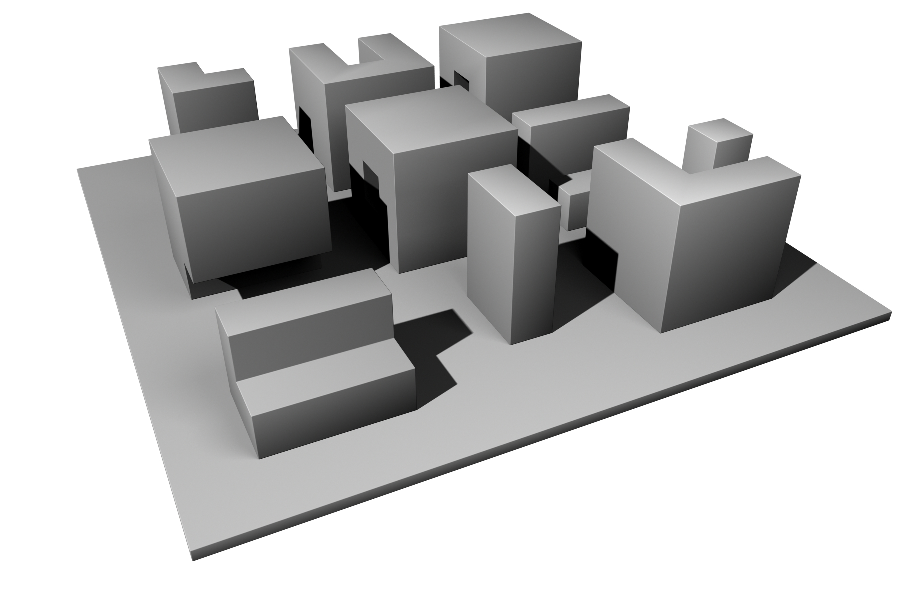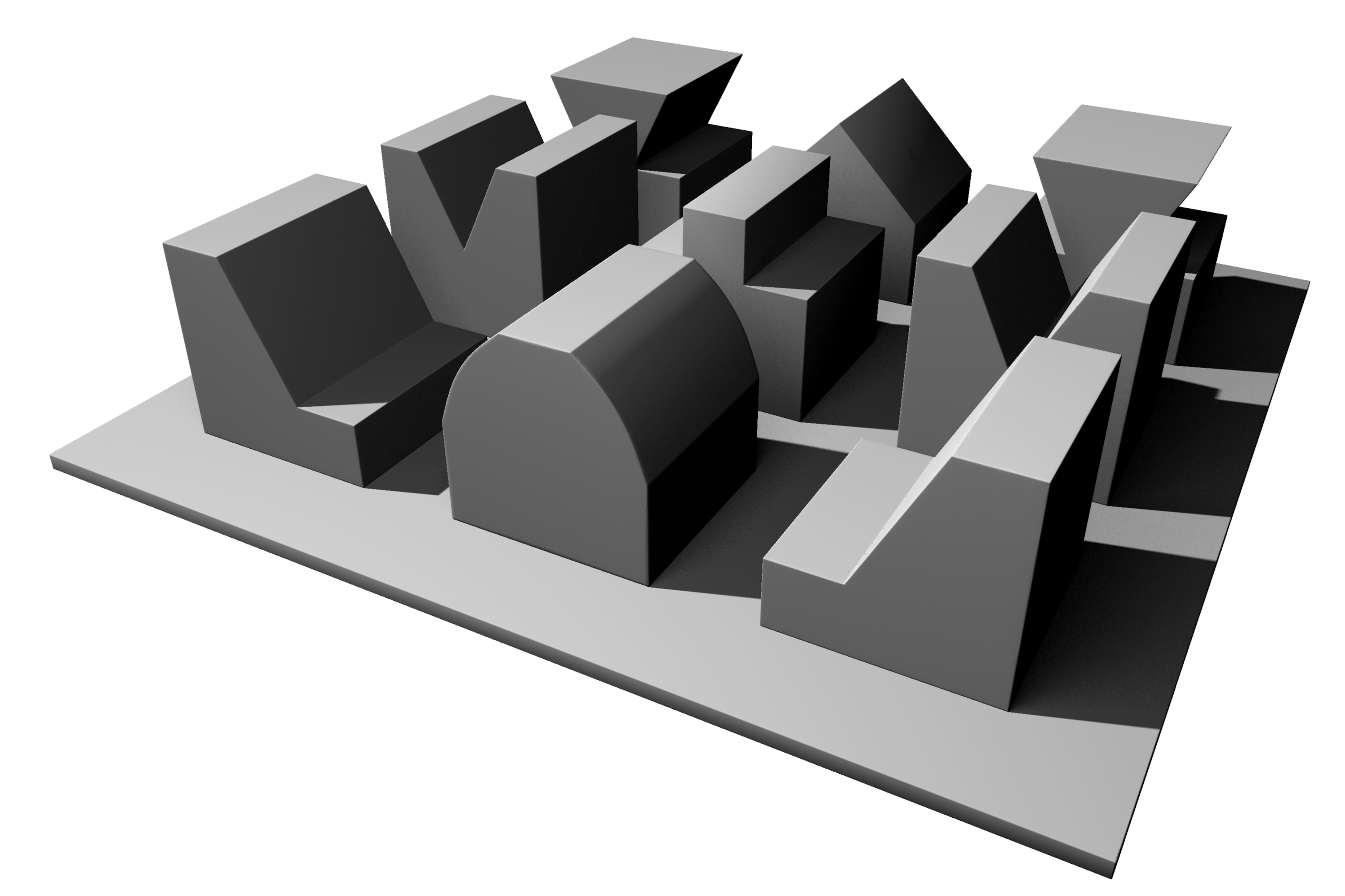 Below you can see an orthographic top view of a variety of mass-void relationships in a nine-square grid, where the white square represents the presence of a mass. The dark and light gray squares represent void spaces on the grid, a bit like the pattern of a tiny chess-board: