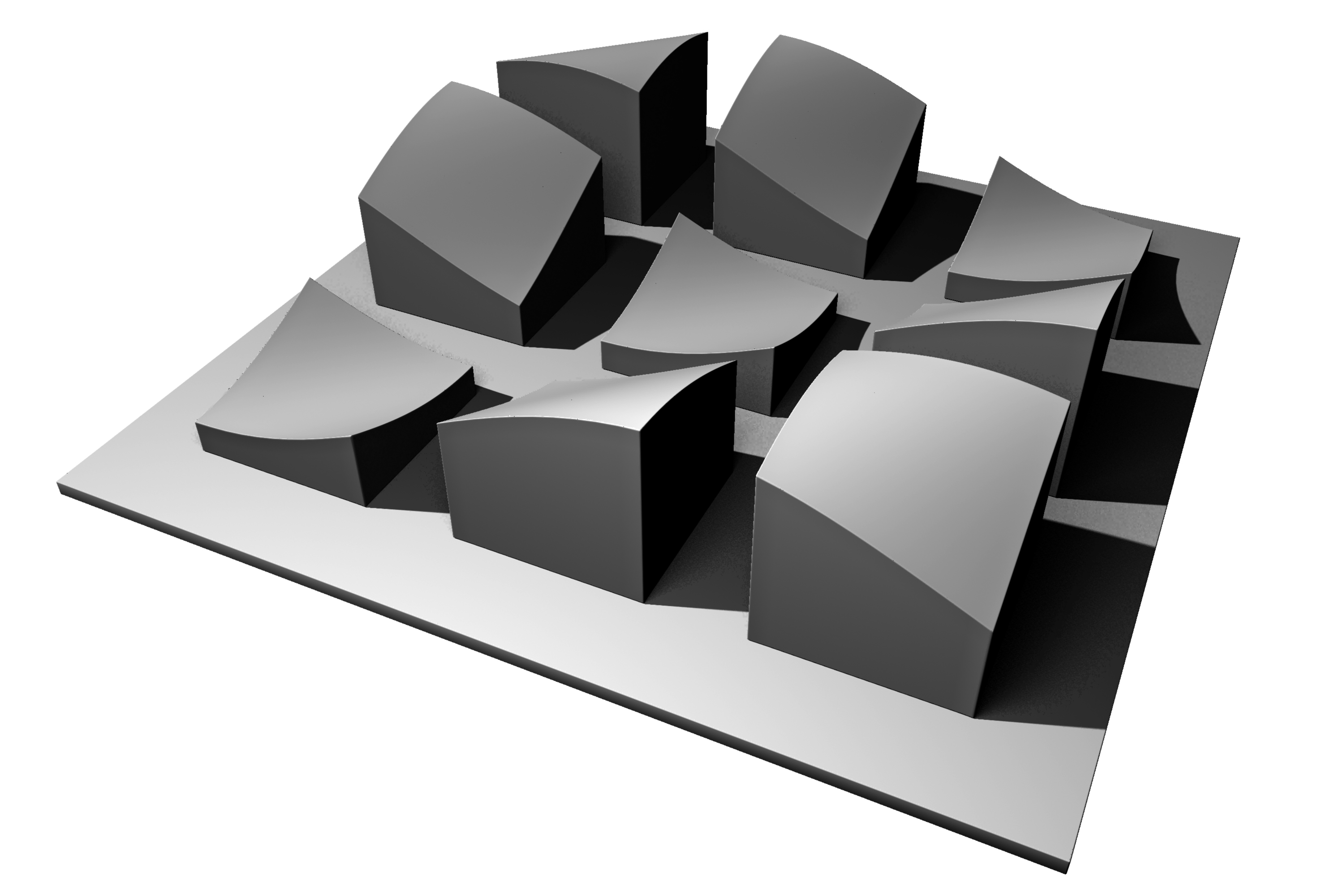Return to the project. COPY the original file, rename the file yourname_nineSquareGrid02, and open it to make, or in some instances re-make, the objects, this time with an eye toward creating realistic micro-bevels. If you were successful with the micro-bevel exercise above, you’ll have no problem developing the 5 manipulated solids.