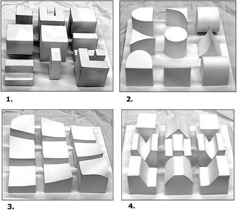 In a tactile 3D design course, the classic Nine Square Grid is done by exploring different materials, such as plaster or bristol board, and explores processes such as additive or subtractive modeling. The forms are typically abstracted materially by applying white paint—a suitable move for our exercise, with its emphasis on form and volume. In a 3D design course taught by Ray Horner at Kean University, students create the variety of forms seen below.