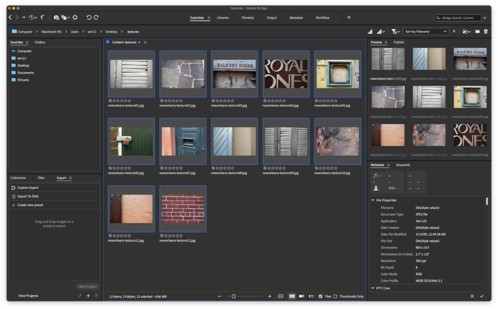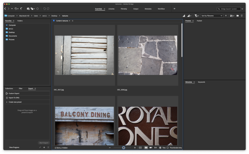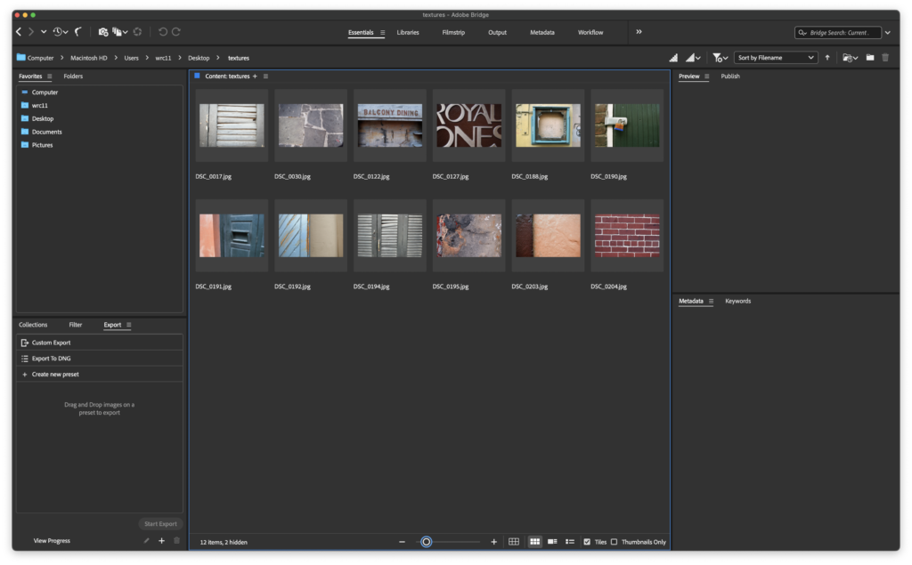 Notice the file path to this folder towards the top left side of Bridge, located in the Path Bar. If you don’t see this, choose Window > Path Bar to hide it, then choose Window > Path Bar to show it again. In our sample, the path is Computer > Macintosh HD > Users > wrc11 > Desktop > textures.