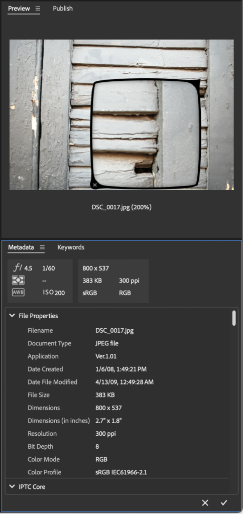 The Metadata panel displays important information about the file, including camera information if it is available. If you are looking at the images included in the textures folder you will notice the camera information including the f-stop, shutter speed, metering method, white balance setting, and ISO rating are all recorded in the top left box beneath the Metadata panel name. In the top right box you can see the pixel dimensions, file size, resolution, and color mode. In the File Properties area, more information about the file is included, such as file name, file type (called Document Type), date created and modified, and more.