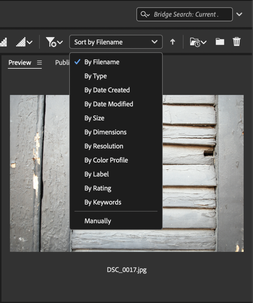 Click on other pull-down menu options you may notice that files will reorganize in Bridge. It is important to note that although your view in Bridge may change, the files remain in the folder on the hard drive. From the Desktop or alternative folder view, the files can always be viewed in your operating system using the View menu from within the Finder.