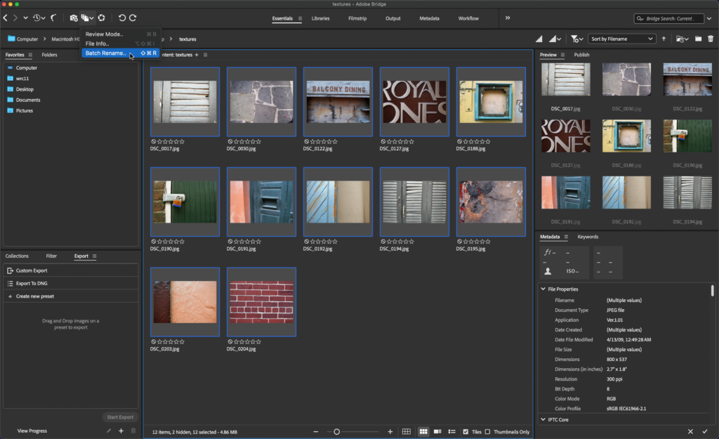 Select all of the files in the texture folder in Bridge by pressing the key command Command+A or by clicking one time on the first thumbnail image, then holding the Shift key while clicking one time on the last thumbnail image. While files are selected, locate the Refine icon at upper left and choose Batch Rename from the dropout menu.
