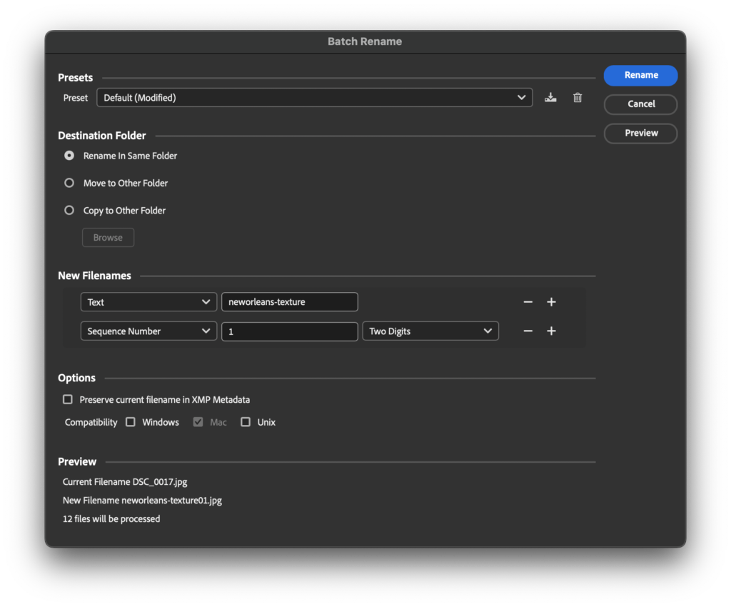 The text value will always remain the same, so it is important to use a name that is important to the group of files. For this, we simply used neworleans-texture as the name since all the files in are images of textures taken in New Orleans. Observe the results after hitting Rename: