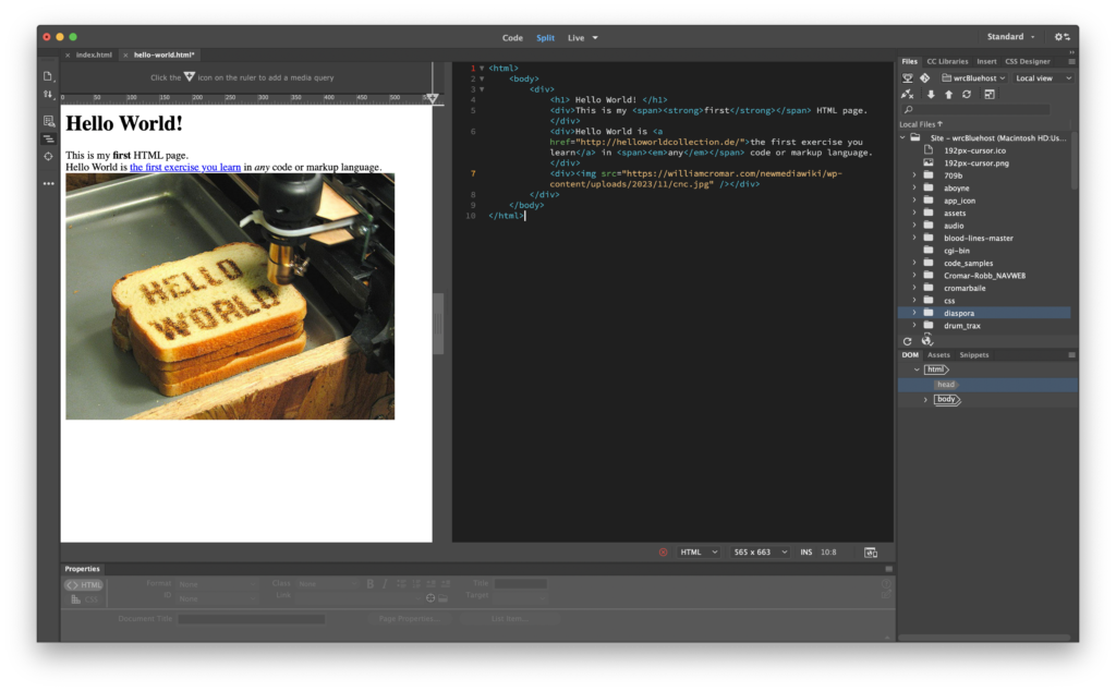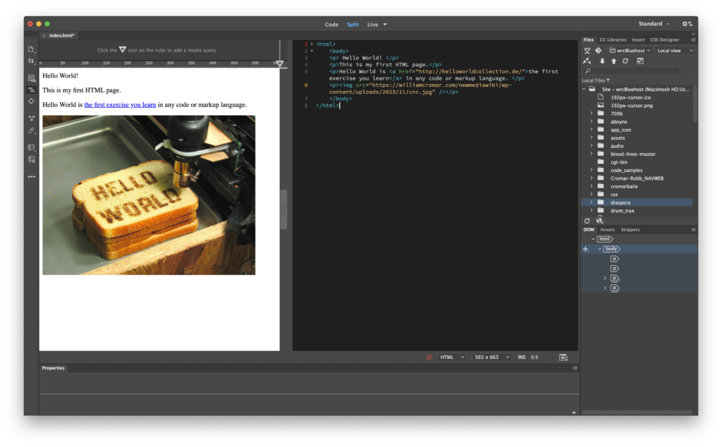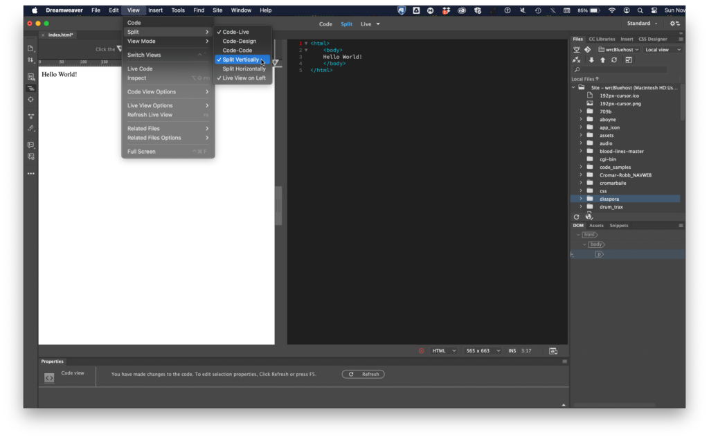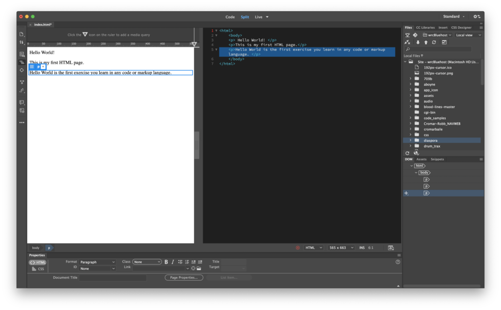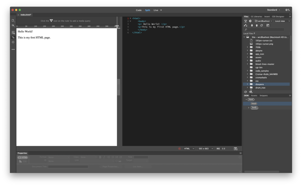In this exercise, we will modify the file we just made. Open Dreamweaver from the Dock or Applications Folder. In Dreamweaver click File > Open and navigate to your index.html file. When it opens, in the upper center of the user interface (UI) select Split View. Split View displays both the code and the result of the code like a browser. Another way to think about this is that the code view is the instructions to the browser and the design view is the way the media looks in the browser. If the screen splits horizontally, it’s pretty terrible for writing code. You can switch it to a more useful vertical split by going to the menu View > Split > Split Vertically and selecting it.