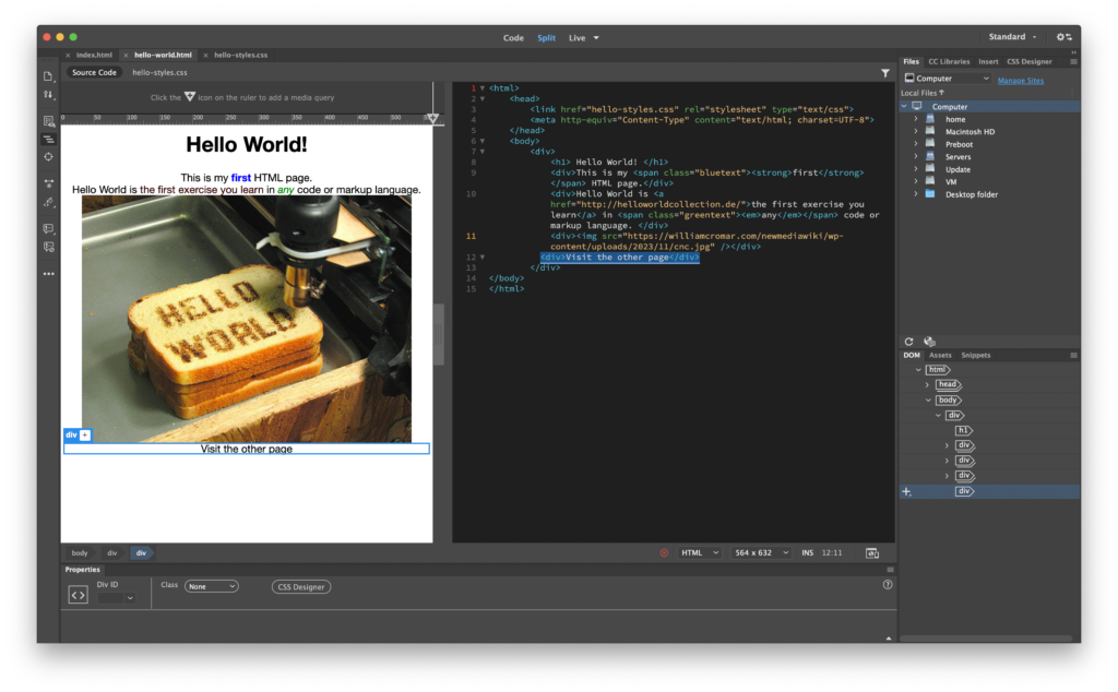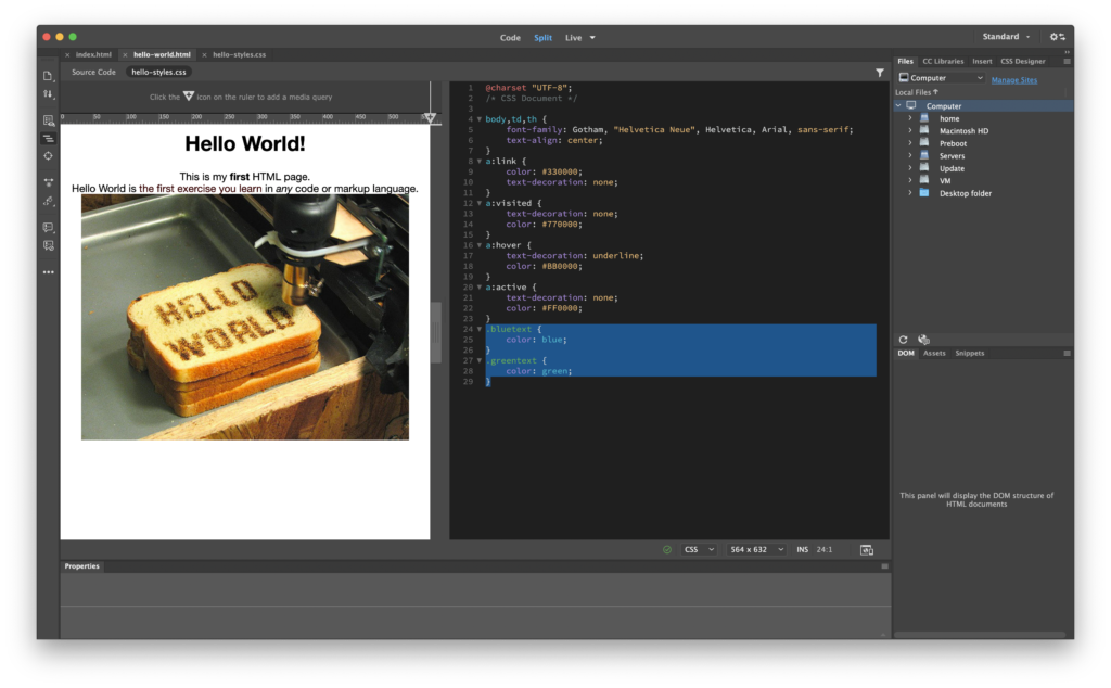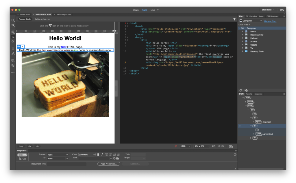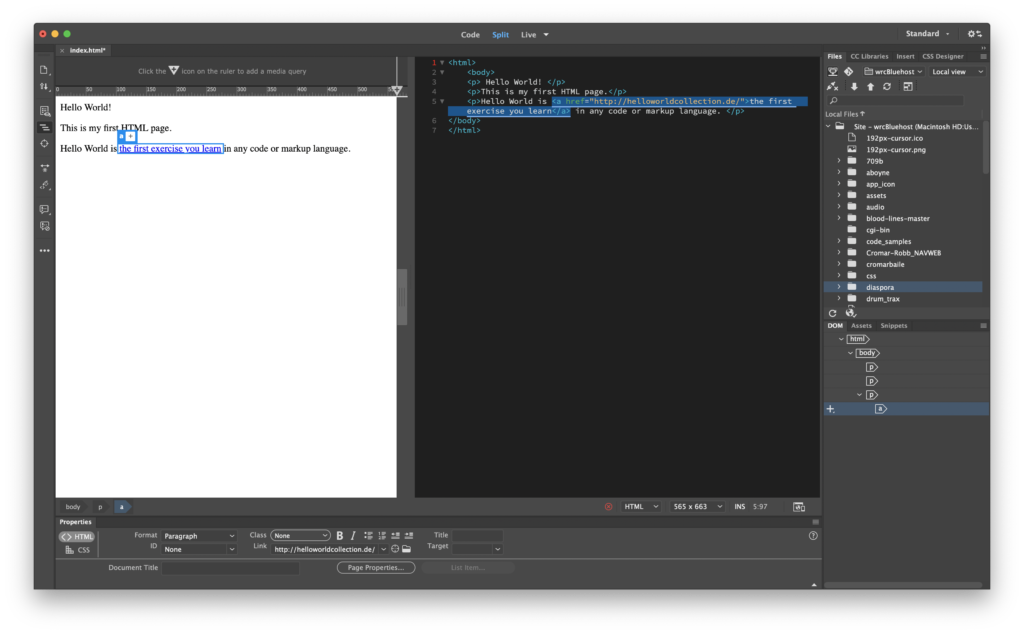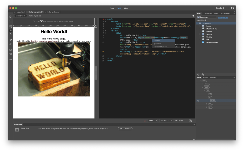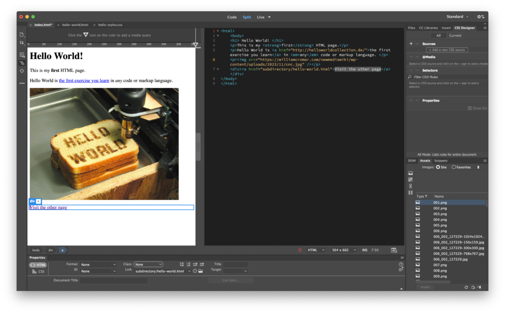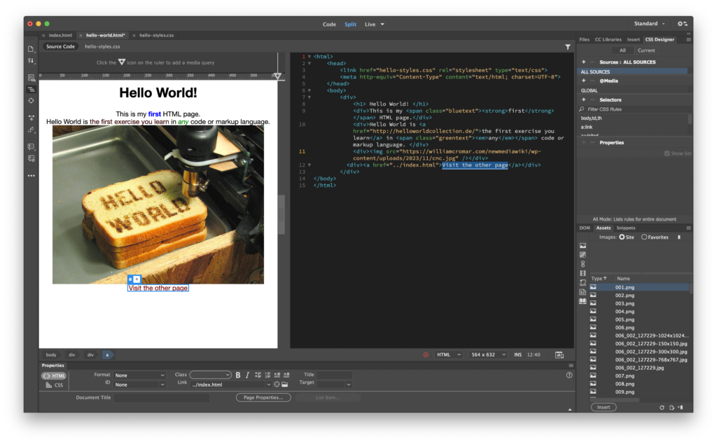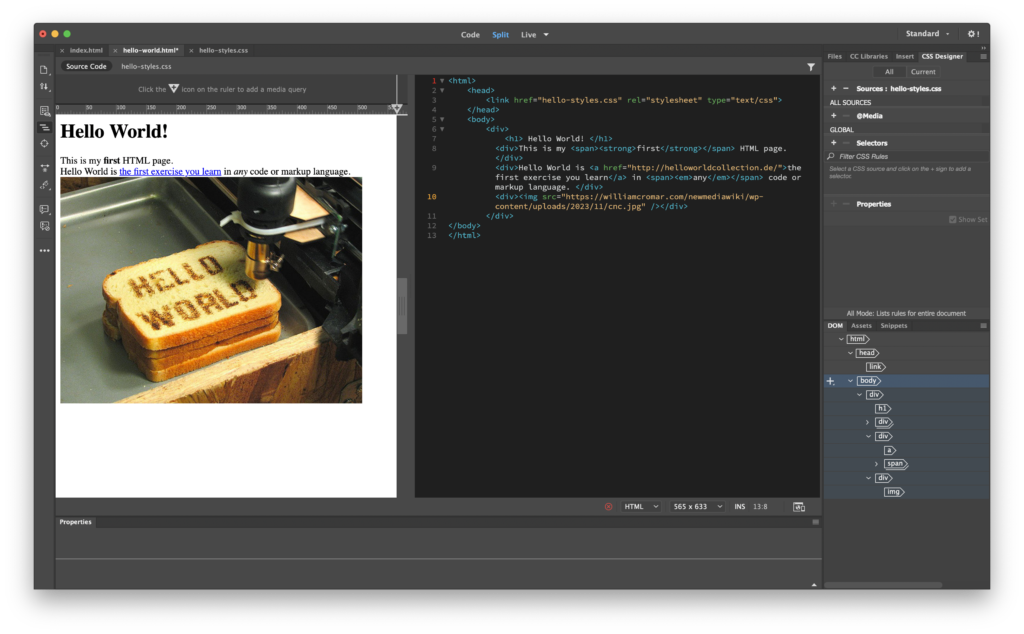 In Dreamweaver, open your Hello World! index.html page if it’s not already up.