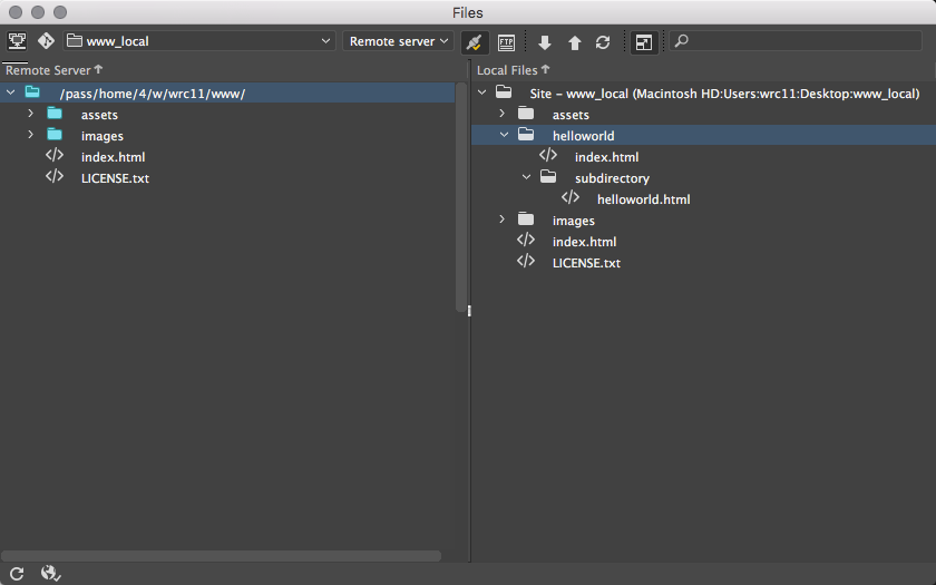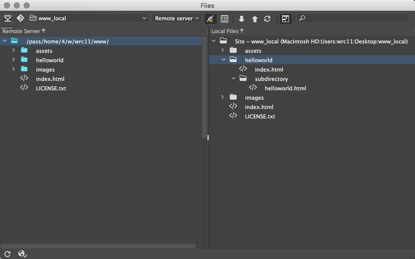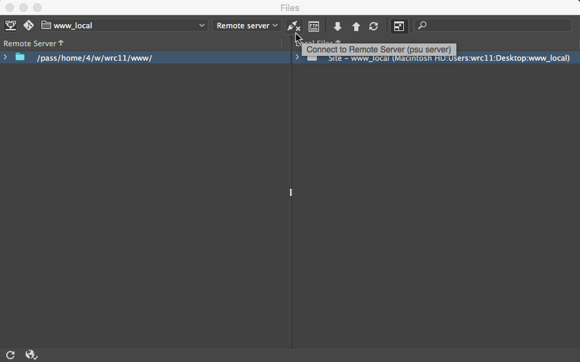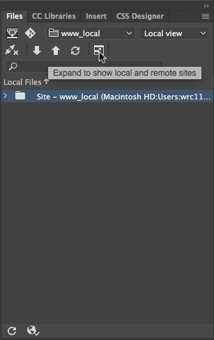 Once you’ve completed this and entered the server via SFTP, look in the Files Palette to view the root folder for the site you just defined. Click on the button at the right to expand the view to see both the local (files on your hard drive) and remote (files on the server) sites.