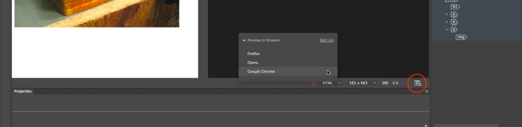 Dreamweaver is a WYSIWYG editor because you can change the code by using Dreamweaver pull-down menus and buttons in Design or Live View. It should rather be called a WYSIWYGMOTT, or What You See Is What You Get Most Of The Time. The Design and Live Views are about 95% accurate. Please don’t rely on them fully! When designing for the web, always view your work in an actual browser as you design. Most designers view their work in multiple browsers to see if their code adheres to cross-browser compatibility.