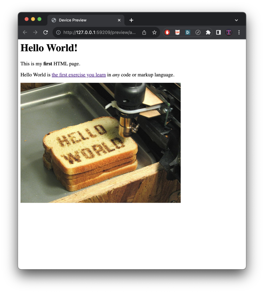 Open a web browser (we used Chrome), click File > Open, and navigate to the index.html file. Notice that Hello World! is the only visible part of the code. However, you can display the code: go to View > Developer > View Source, or right-click in the browser window and select View Page Source in the contextual dropout menu. Wording and workflow may differ from browser to browser, but all modern browsers have this capability.