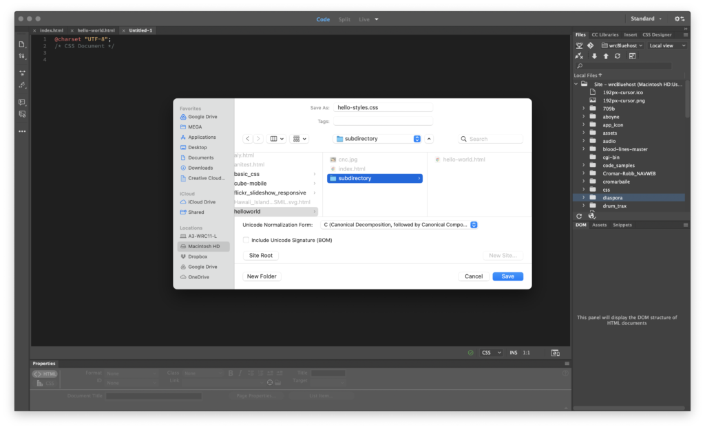 First, we’re going to create a directory hierarchy. Create a folder in the helloworld folder that already contains our index.html file. Name that folder subdirectory. Copy the index.html file and place the copy in the subdirectory. Rename this file, calling it hello-world.html. Open it in Dreamweaver.
