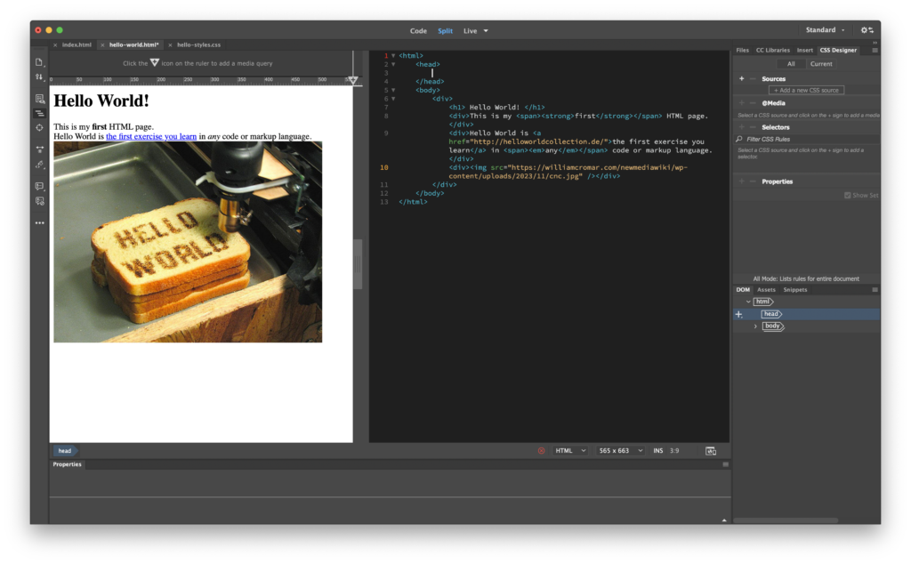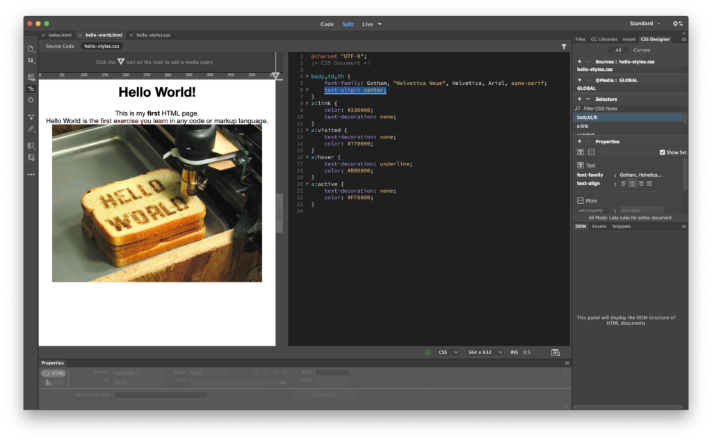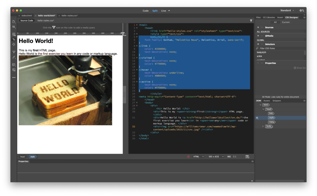 Notice how you can now toggle back and forth between HTML (the Source Code tab) and CSS (the hello-world.css tab) in the code window but keep the Live view split open. This is super useful for our window switch! Under the Source Code tab, select and copy everything inside (but not including) the <style> tags. Now choose the CSS tab, and paste it into the CSS document. Return to the Source Code tab and delete everything from <style> to </style> out of the HTML <head>. However: keep the <meta> tag and its properties and values, which Dreamweaver created when it generated the font-family code. These help the browser more about your file and how to interpret it.