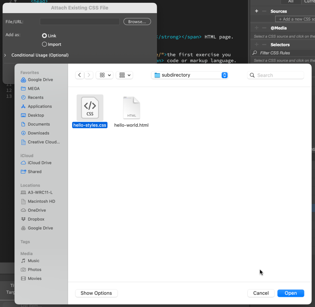 This action will open a dialog box. Select the Link radio button, then hit the Browse… button and navigate to the hello-styles.css file in the second dialog box that opens. Select it and hit Open. After the navigation dialog disappears, select OK in the first dialog box.