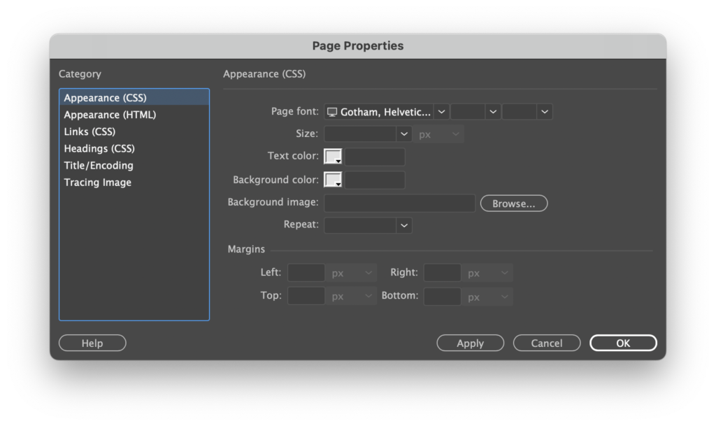 Let’s start with declaring fonts. This is a bit tedious to code by hand, so Dreamweaver has a fairly easy UI for handling this. Activate the Properties Palette by placing the cursor somewhere in the content. In the palette, find the Page Properties button and this opens a dialog box.
