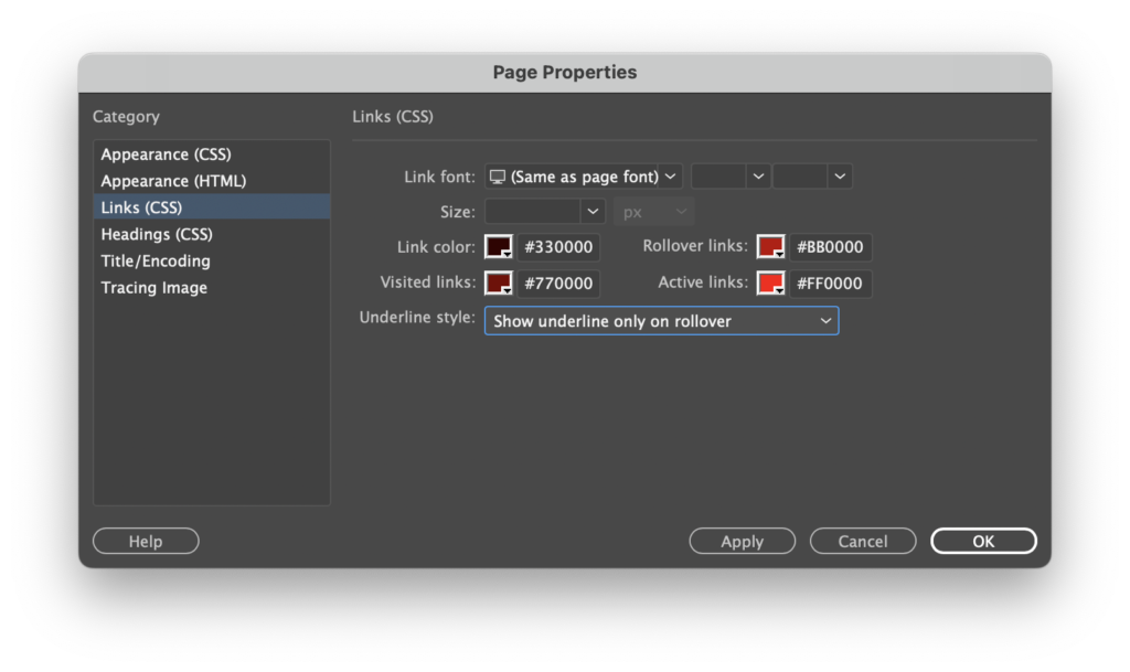 We’ll continue using this dialog box to style Links (CSS). Link styling is particularly laborious to do by hand, so this is a welcome relief. For Link font: we choose the same font as the page font, and for the various states of links, we set various shades of red. For the Underline style: we set it to Show underline only on rollover from among the choices in the dropout menu.