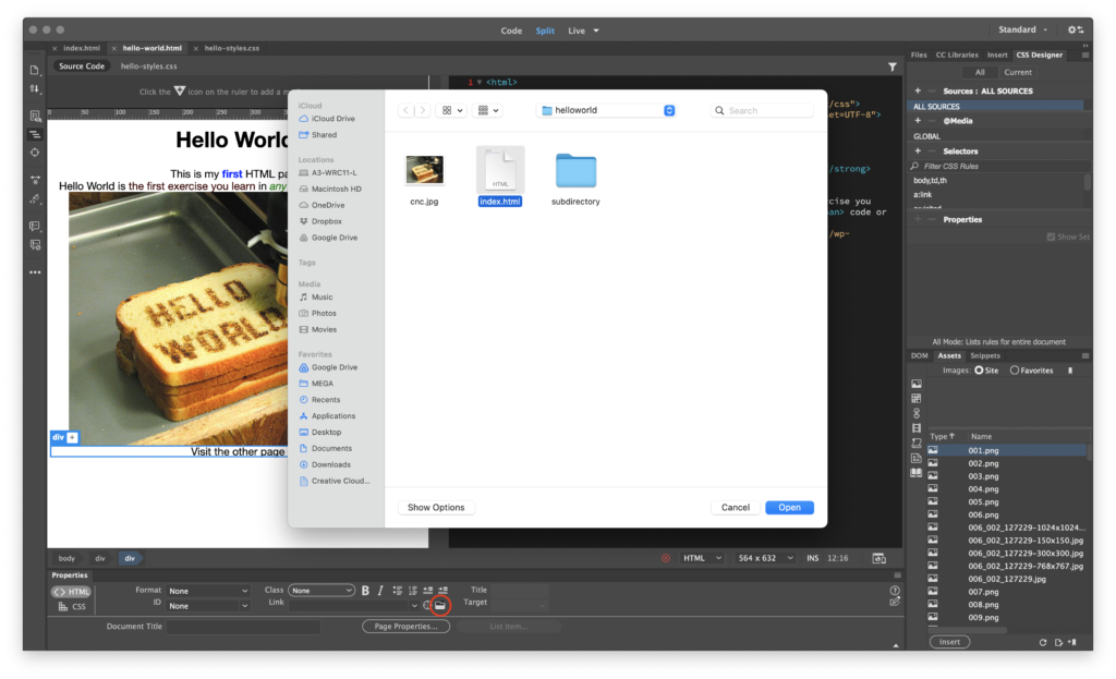 Start in the hello-world.html file. Highlight the Visit the other page text, and in the Properties Palette, find the folder icon to the right of the Link field and click on it to open a navigation dialog box. Use this to find and select the index.html file, then click Open.