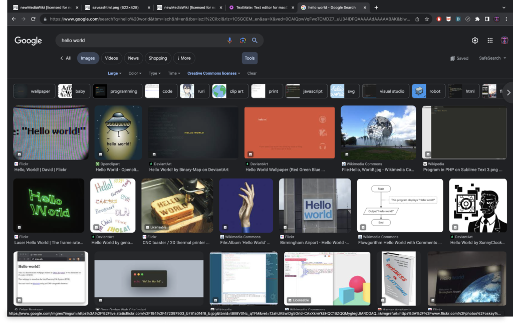 We will search for a Creative Commons-licensed image to work with. Open a browser window and consult a search engine for the term “Hello World” in an image search. Using Google, you can use Tools > Usage rights > Creative Commons licenses and Size > Large to narrow the search.