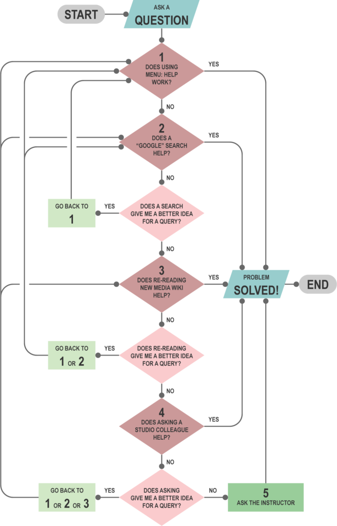 If you are in a studio, colleagues and upper-level students are almost always around, and they are taking or have taken the course, so they are a resource for you. Someone will almost always know. If that doesn’t work…