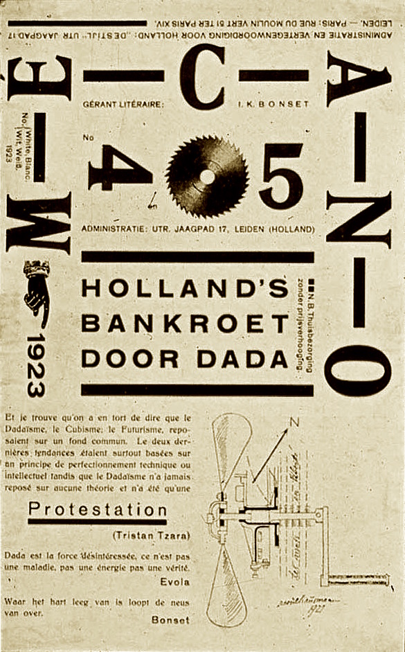 In the typographic design of their journals seen below, compare expressions of Dada’s chaos-as-order nihilism to De Stijl’s precise utopian order. Both challenged European establishment and both sought any means to do so, from painting to performance, poetry to graphic design. But the movements seem to reflect opposing points of aesthetic departure… right?…